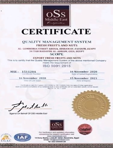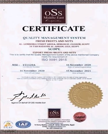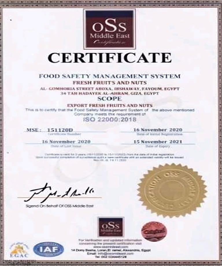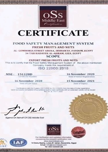 At Fresh Fruits and Nuts, we are dedicated to providing the finest quality produce, harvested with care and delivered with passion, and for that we got the international certificates that indicate how we match with international cods for example ISO9001 & ISO22000